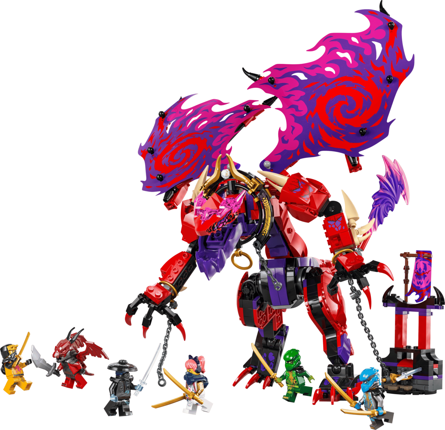 LEGO® NINJAGO Kaosdraken Åsktand är perfekt för barn som älskar ninjaaction. Med rörliga delar, prismatiska svärd och 6 minifigurer får barnen en kreativ och interaktiv bygg- och lekupplevelse.