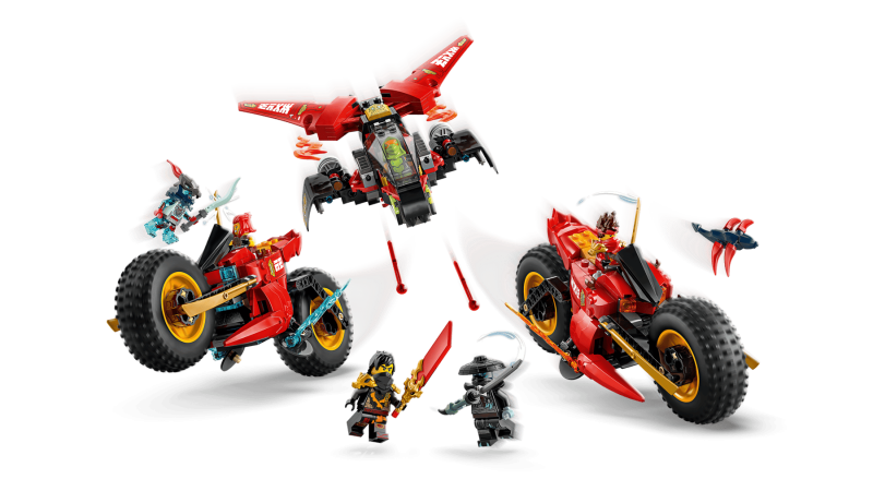 - 3-i-1-ninjafordon: stort stridsfordon kan delas i Kais motorcykel, Wyldfyres motorcykel och Fraks jetplan