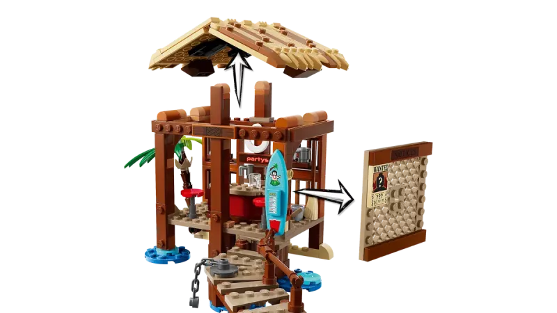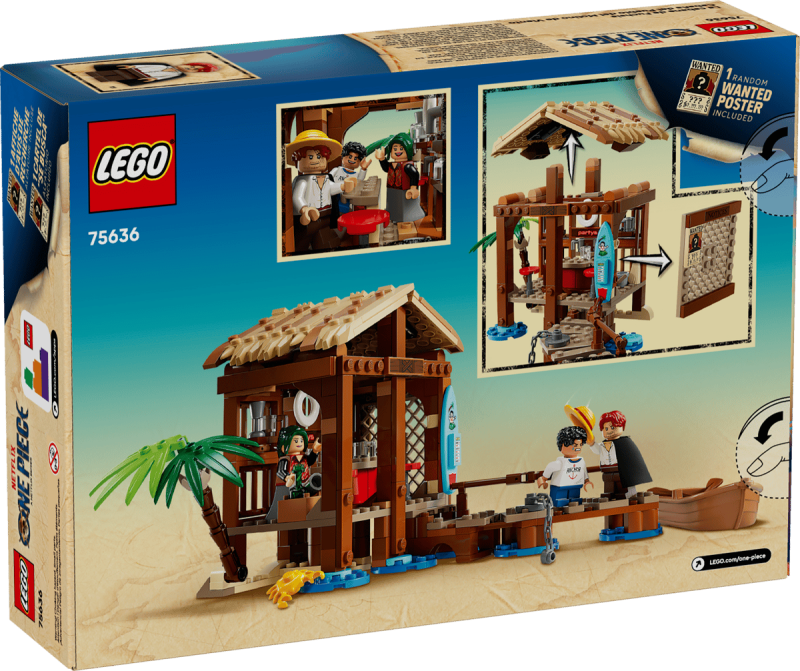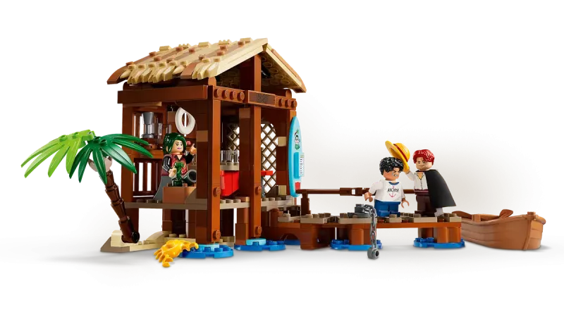 Setet innehåller minifigurerna Luffy, Shanks och Makino, samt byggbara miljöer som strandbutik med avtagbart tak och piratbåt fastsatt vid bryggan med kedja. Tillbehören inkluderar en ”Wanted”-affisch, mystisk djävulsfrukt och plats för fler affischer från andra ONE PIECE-set. Med LEGO® Builder-appen kan barn zooma, rotera och följa byggstegen i 3D.
