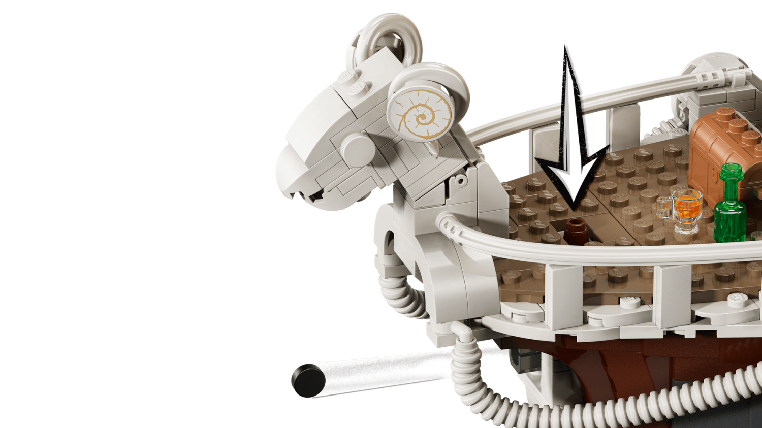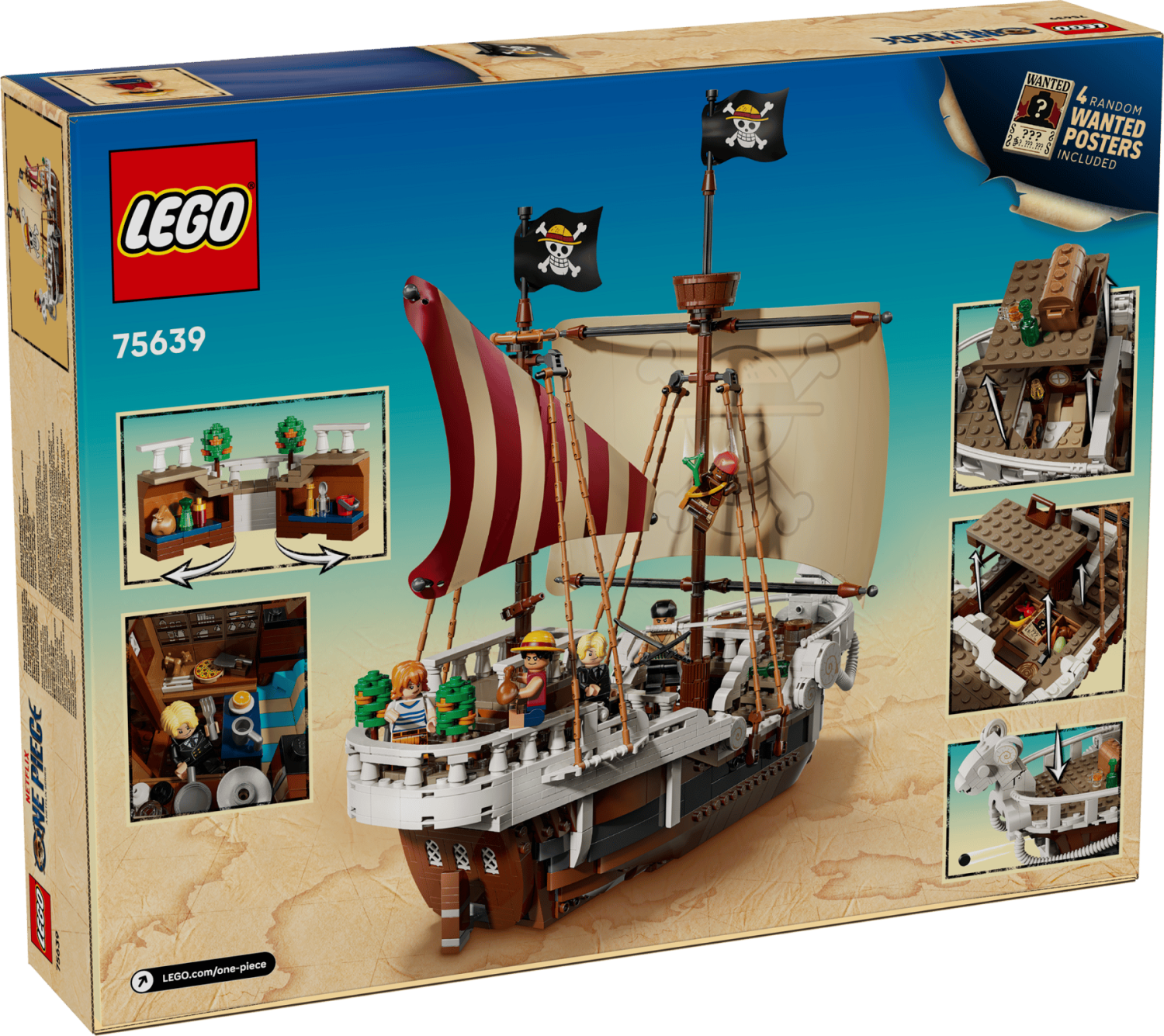 Setet innehåller 5 LEGO® ONE PIECE minifigurer: Monkey D. Luffy, Zoro, Nami, Usopp och Sanji, samt 4 "Wanted"-affischer. Luffy kan placeras på galjonsfiguren, Usopp håller vakt i mastkorgen och Nami styr rodret. Perfekt för både lek och uppvisning.