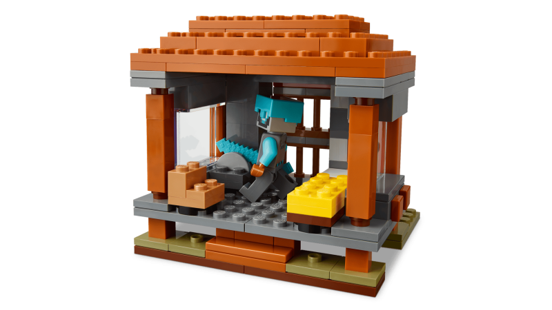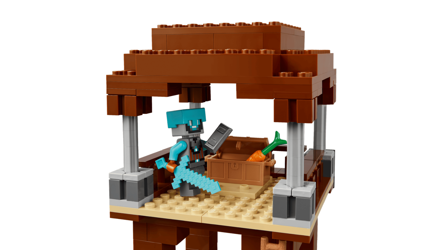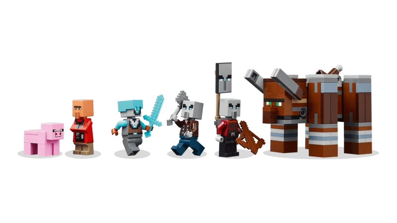 Setet innehåller 4 LEGO® Minecraft® minifigurer: rymdväktare, rädkapten, stenhuggarbybo och övertygare, samt byggbara figurer av en vildtjur och en gris. Leksetet har autentiska tillbehör som träningsdocka, fackla, morot, järntacka, diamanthjälm, diamantsvärd, armborst och järnyxa. Barn kan använda appen LEGO Builder för 3D-zoom, rotation och digitalt stöd under bygget.
