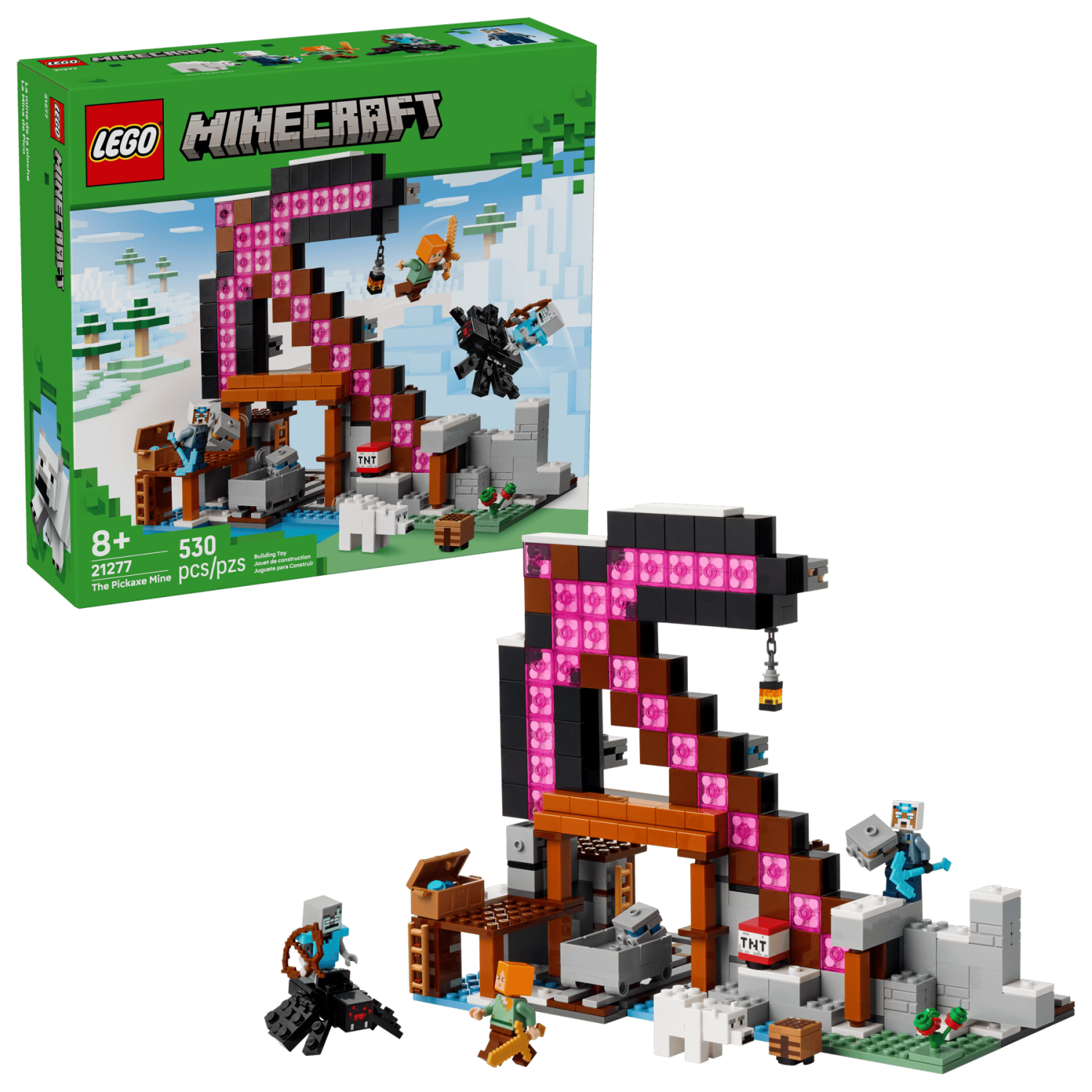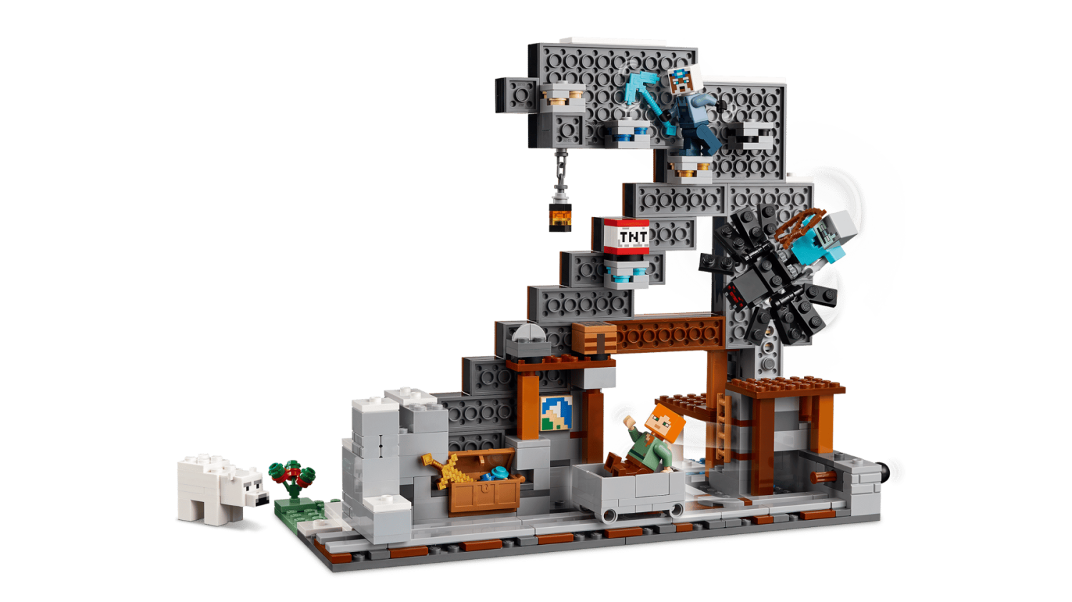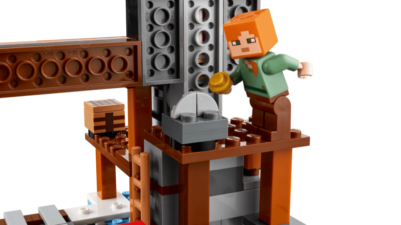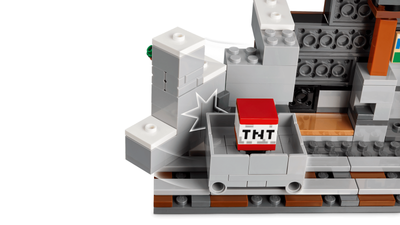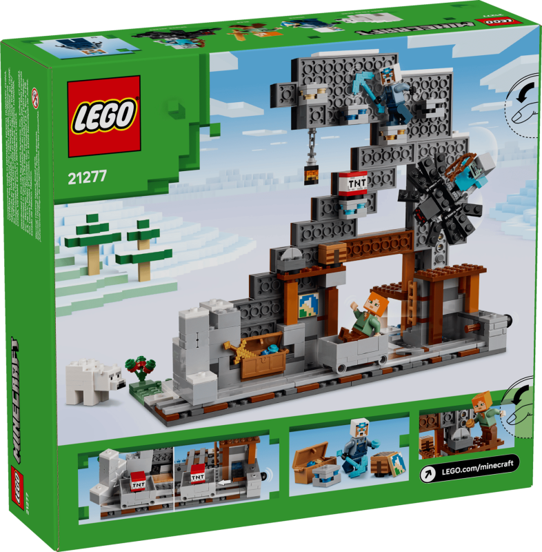 Setet innehåller 3 LEGO® Minecraft® minifigurer: Alex, en gruvarbetare och en strövarspindeljockey, samt en ridbar spindel och en isbjörnsunge. Barn kan spela upp äventyr i gruvan, slåss mot fientliga fiender och transportera malm längs spåret till en kista. Byggarna kan även använda appen LEGO Builder för 3D-zoom, rotation och digitalt stöd under bygget.