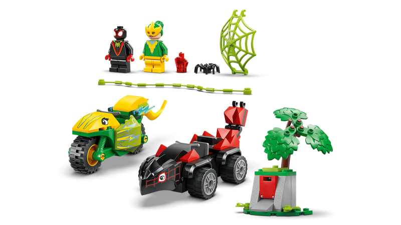 Följ med Miles ”Spin” Morales i hans stegosaurusbil och Electro på hennes dilophosaurusmotorcykel. Bygg och lek med fordonen, knuffa dem framåt och återskapa spännande jaktscener när skurken stulit en dyrbar kristall.