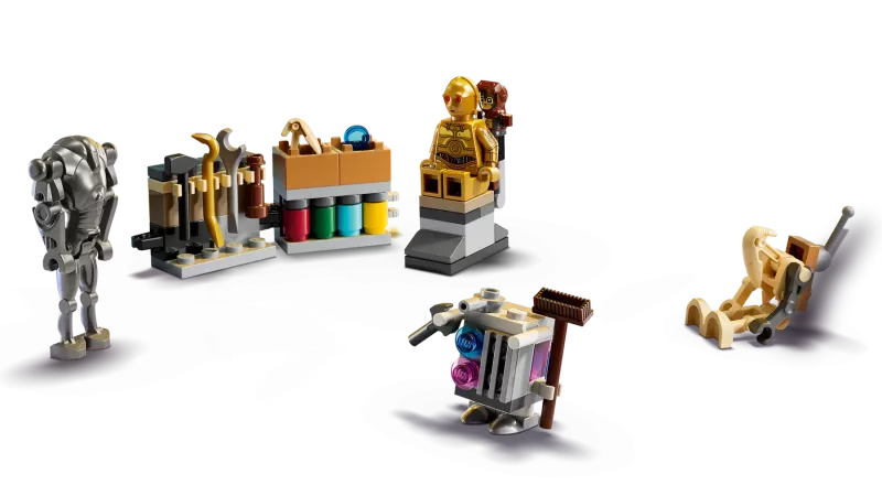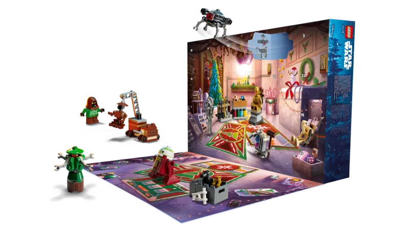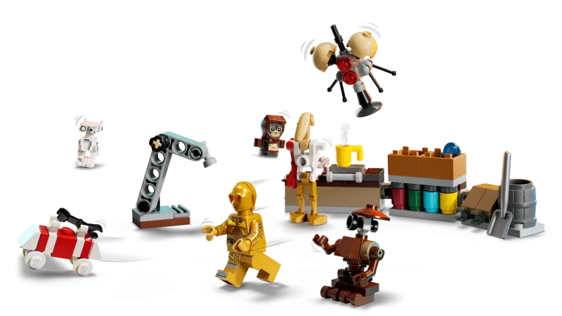 Upptäck droidkaraktärer som BB-8 i snögubbedräkt, en Jawa i julutstyrsel, musdroid och medicindroid – plus LEGO-figuren Babu Frik. Setet innehåller också åtta byggbara droider, inklusive Depådroid, gonkdroid, buzzdroid och B2EMO, samt nio minileksaker som arbetsbänk, verktygshylla, låda med extra droiddelar, byggbart Jawa-fordon och en julgran. Tillsammans skapar de en komplett droidverkstad full av lek och kreativitet.