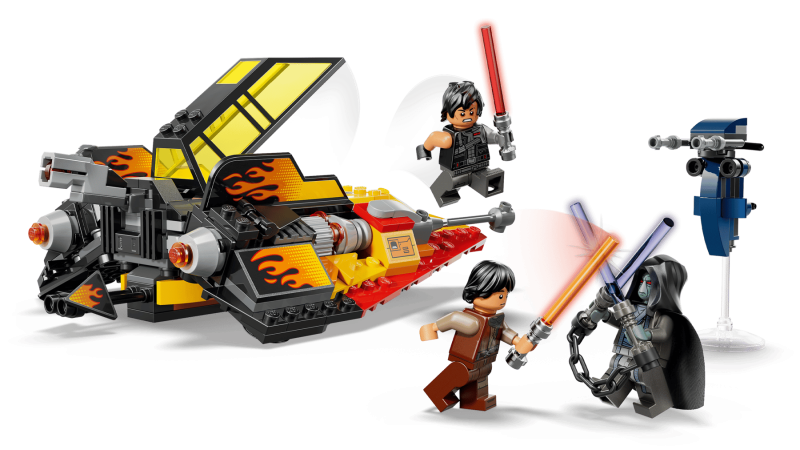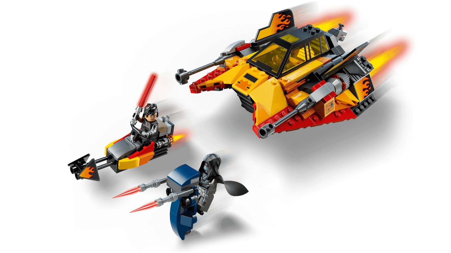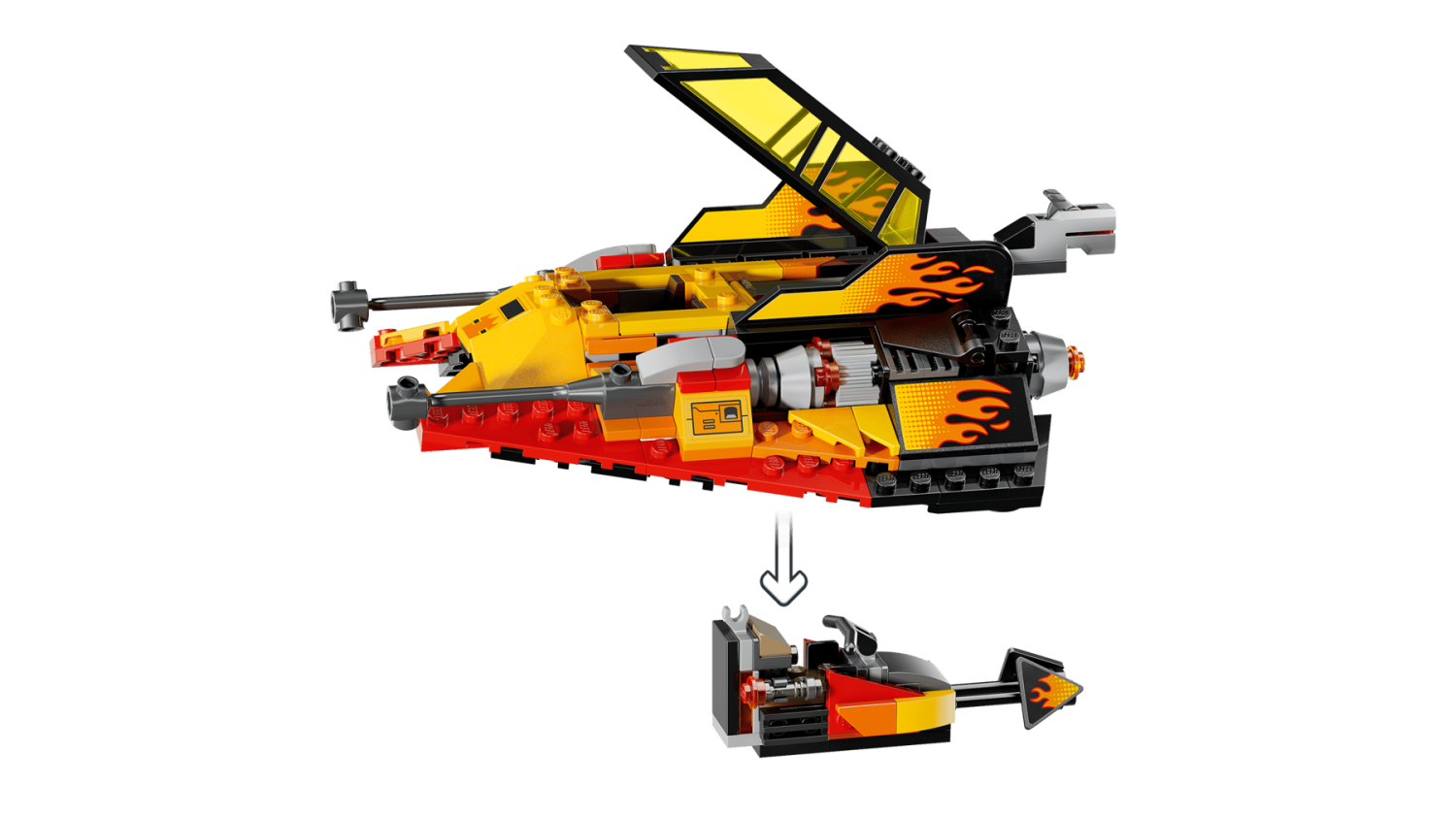 Snowspeedern har iögonfallande flamdekaler, en öppningsbar dubbelcockpit med en dold, avtagbar speeder och en bakre knoppkanon. Tryck på sätet längst bak i cockpiten eller på LEGO® minifigurens huvud för att skicka iväg speedern under actionlekar.