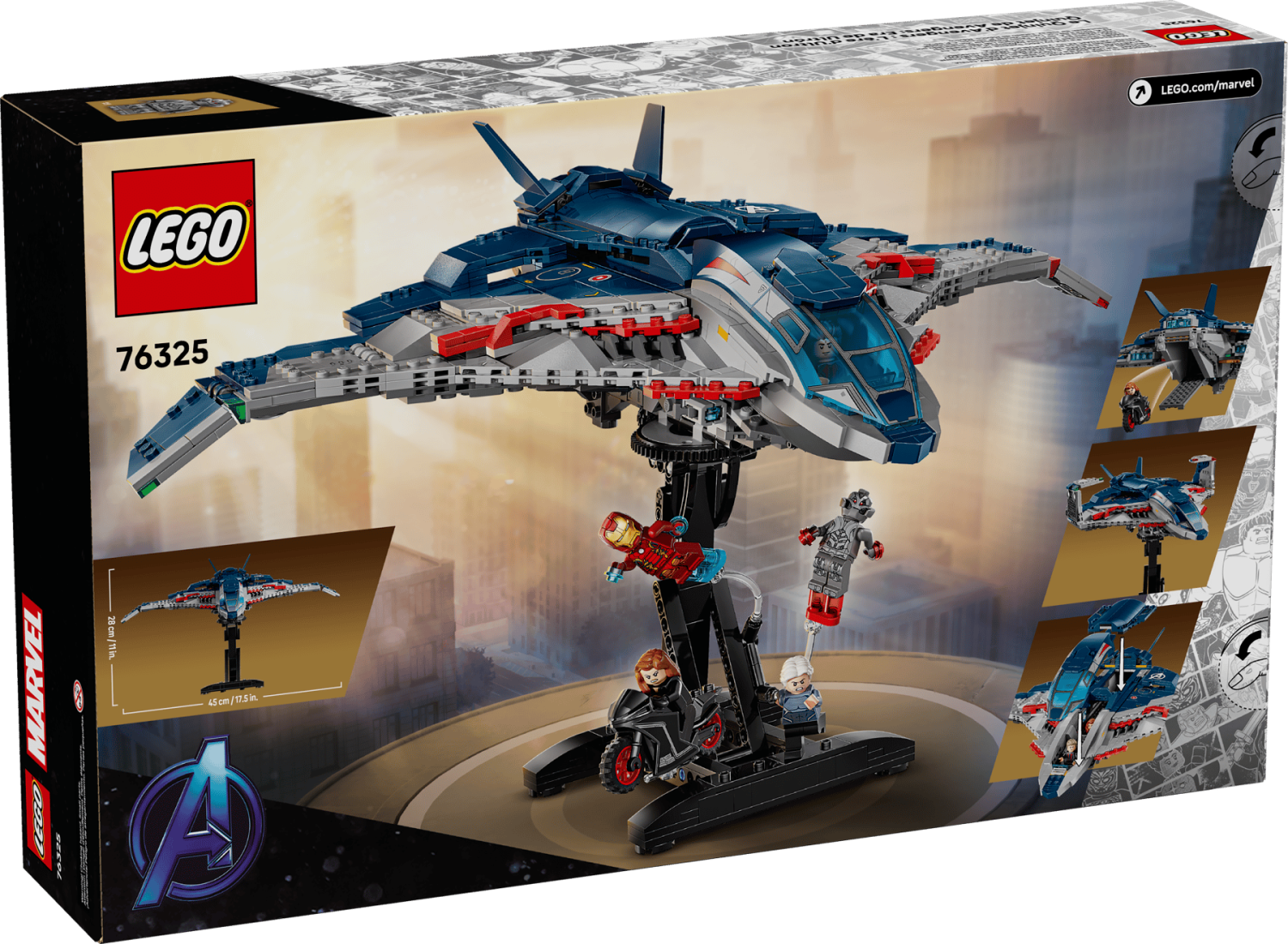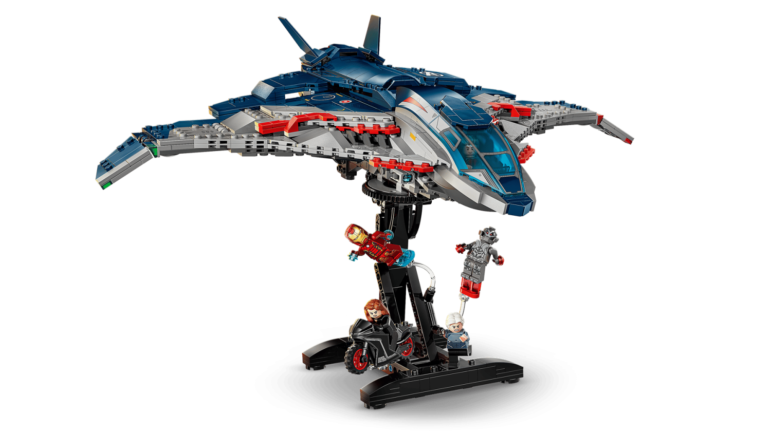 Den byggbara Quinjet-modellen har öppningsbar cockpit, två knoppkanoner längst fram, förvaring för Black Widows vapen och Hawkeyes pilbåge samt en bakdörr som öppnas för att köra motorcykeln in och ut.