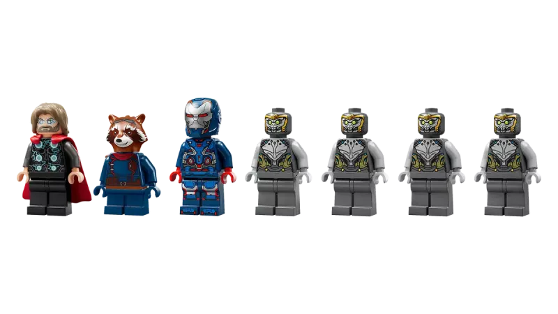 - Sju minifigurer: Iron Patriot MK2, Rocket med stor knoppkanon, Thor med Stormbreaker, och fyra Chitauri (två med gyllene knoppkanoner)
