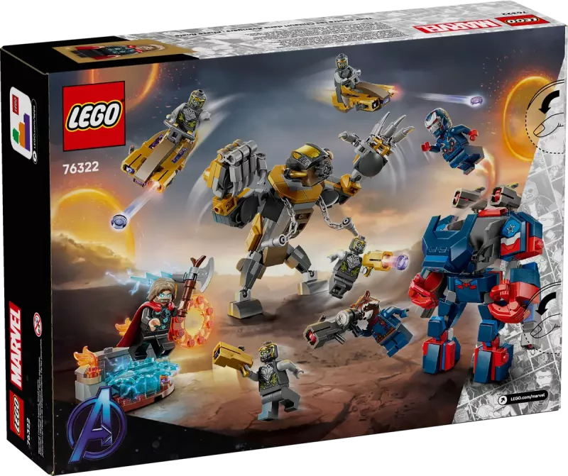 Återskapa spännande strider med LEGO® | Marvel Avengers: Endgame Thor mot Chitauri (76322). Barn från 8 år kan bygga och leka med två stora, ledade LEGO-figurer: Iron Patriot med fyra knoppkanoner och en skräckinjagande Chitauri-gorilla. Setet innehåller också sju minifigurer: Iron Patriot MK2, Rocket med stor knoppkanon, Thor med Stormbreaker och fyra Chitauri, varav två med gyllene knoppkanoner. Dessutom ingår två raketcyklar och en liten miljö för Thor, med plats för extra skjutknoppar. Setet kan kombineras med Avengers: Endgame – slutstriden (76323) för en större actionupplevelse, och byggare kan använda appen LEGO® Builder för att zooma och rotera modeller i 3D.