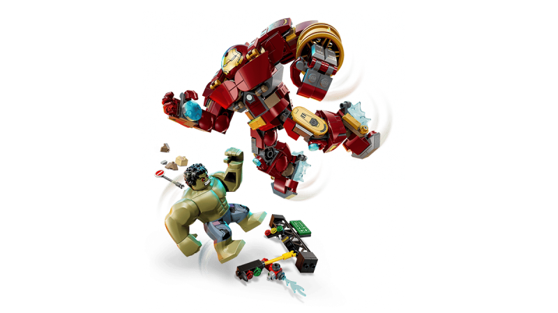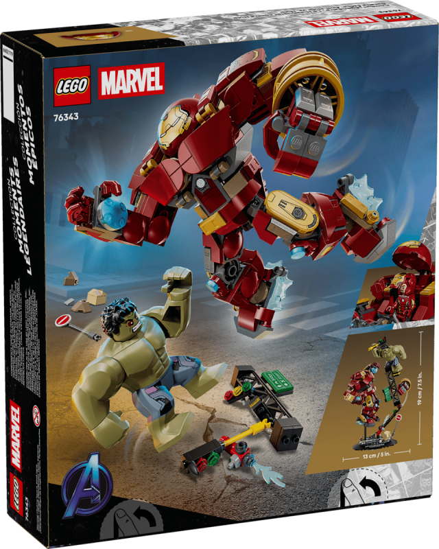 Iron Man strider mot Hulk i en gatumiljö fylld med skrot, skräp, kollapsande stålkonstruktioner och ett trafikljus som Hulk kan använda som vapen. Hulkbuster-roboten är helt ledad för maximal rörlighet. Den robusta basen med namnskylt gör modellen perfekt som prydnad, samtidigt som minifigurerna kan tas loss för oändliga lekmöjligheter. LEGO Builder-appen ger digitala instruktioner med zoom och 3D-rotation för enkel byggning. Setet innehåller 413 delar.