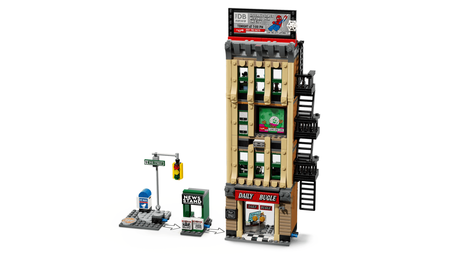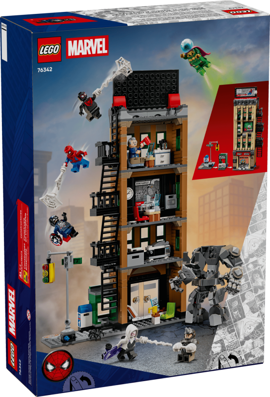 Detta LEGO® ǀ Marvel byggset ger barn möjlighet att utforska actionfyllda äventyr i luften och på marken med genomskinliga pinnar och klossar. Insidan är detaljerad med kontor, reception, nyhetsrumsteknik, kassaskåp och spak för skylten, medan utsidan har brandutgång, flyttbart tidningsställ och gathörn med trafikljus. Perfekt för lek och uppvisning.