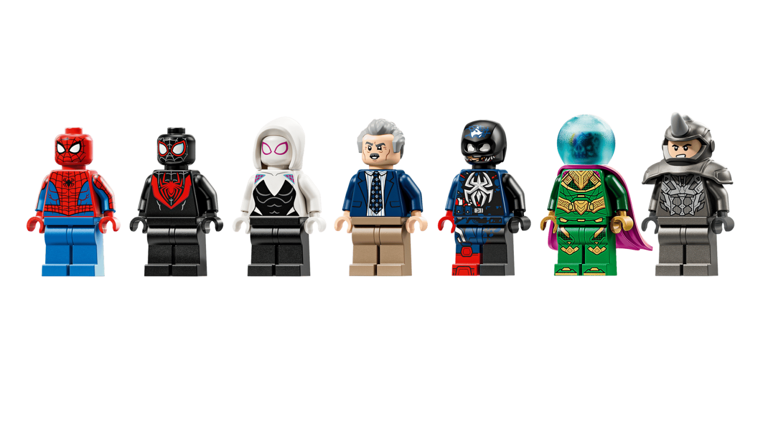 - 7 LEGO® ǀ Marvel minifigurer: Spider-Man, Miles Morales, Ghost-Spider, J. Jonah Jameson, Mysterio, venomifierad Captain America och Rhino