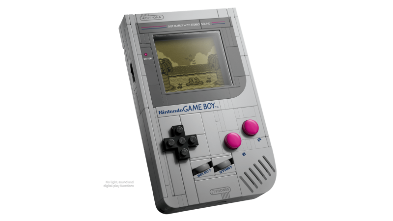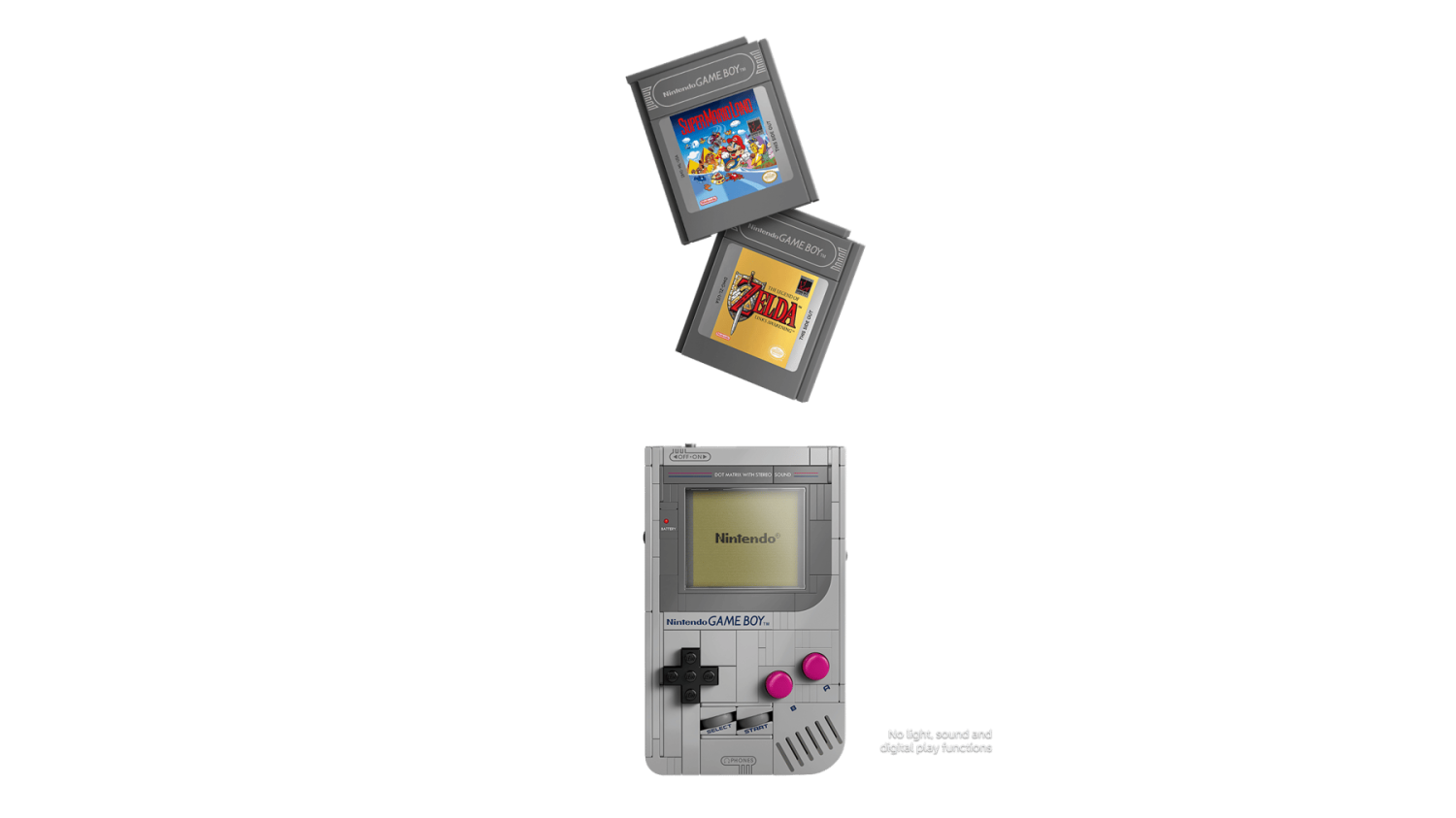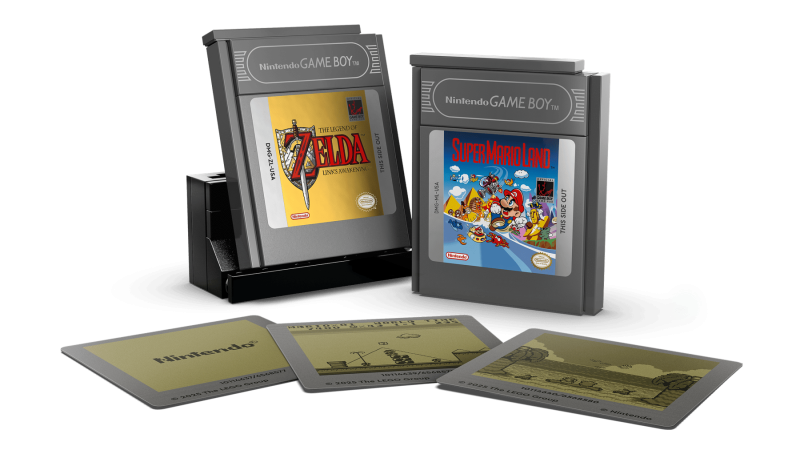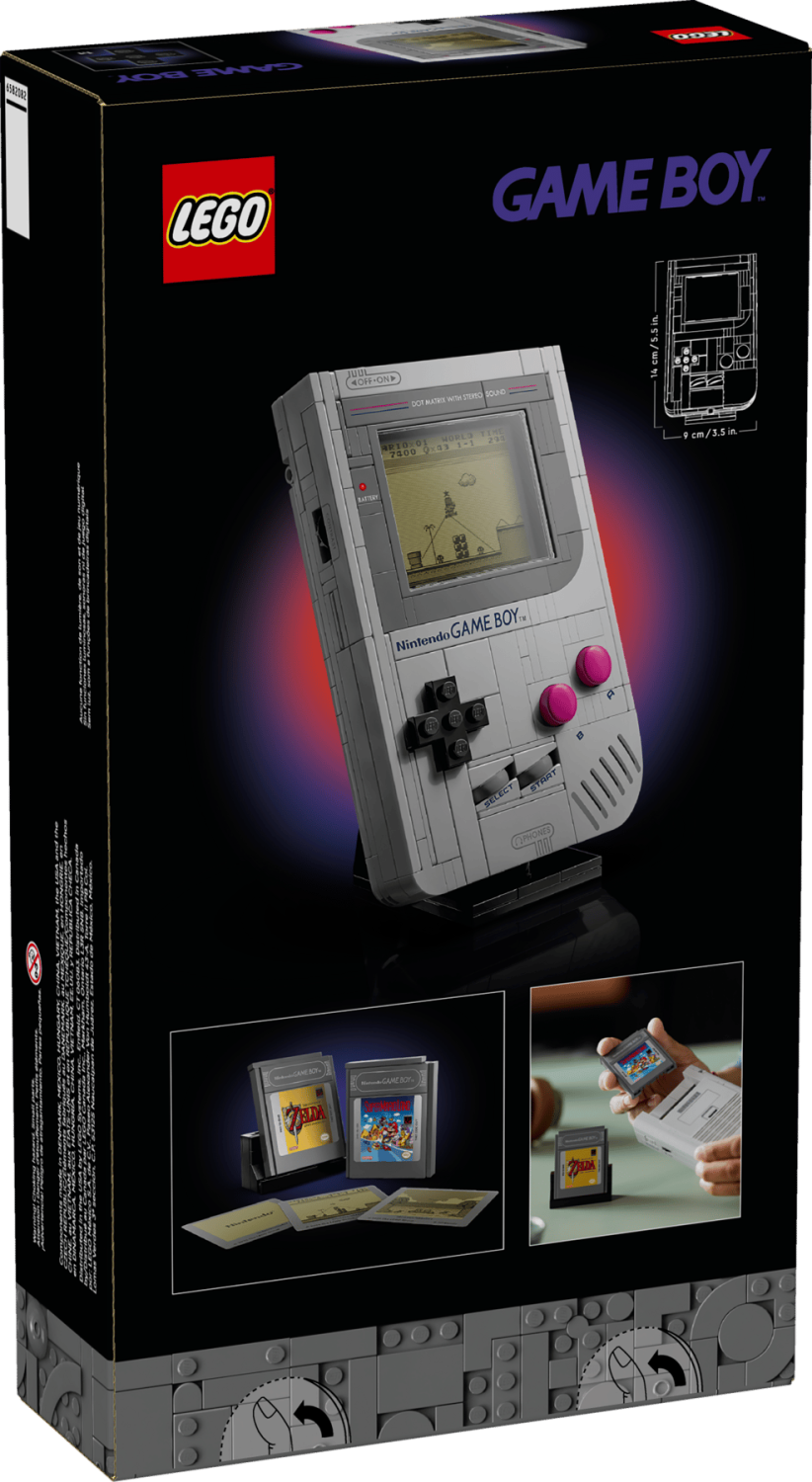 - Utbytbara spel: Innehåller klossbyggda kassetter (Game Paks) för Zelda och Super Mario Land med matchande skärmbilder.