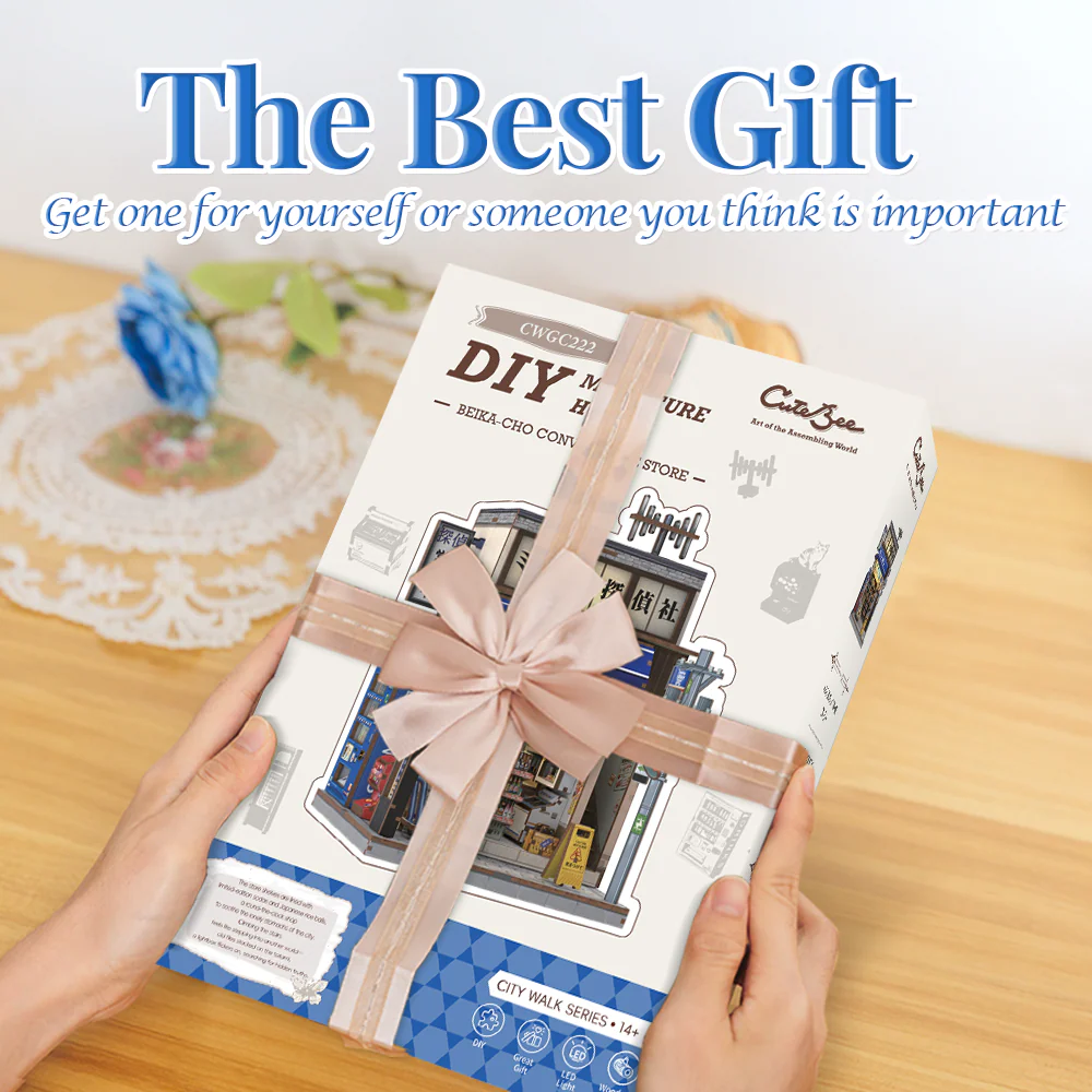 Ett DIY-miniatyrhus i premiumträ med 288 delar, detaljrikt japanskt gatuhörn och varm belysning som skapar en charmig och avkopplande byggupplevelse.