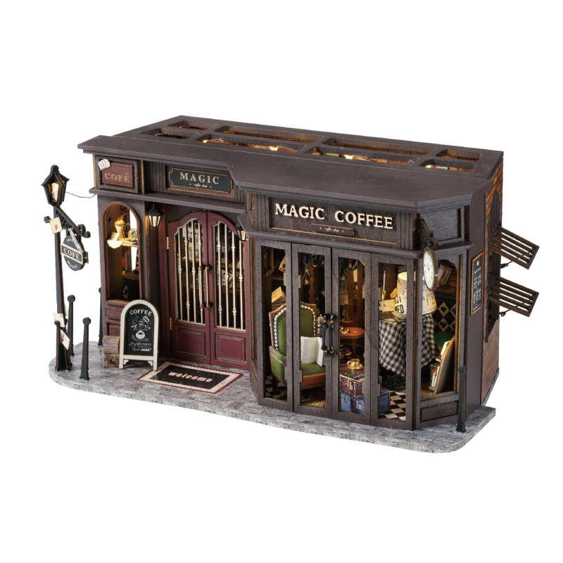 Magic Coffee Shop är ett detaljerat DIY-kit i skala 1:60, tillverkat av trä, papper och tyg. Byggsatsen innehåller alla delar som behövs för att skapa ett charmigt och magiskt miniatyrcafé, med tydliga steg-för-steg-instruktioner på engelska. Den färdiga modellen blir en elegant dekoration och ett samlarobjekt som lyser upp varje rum med lekfull fantasy.