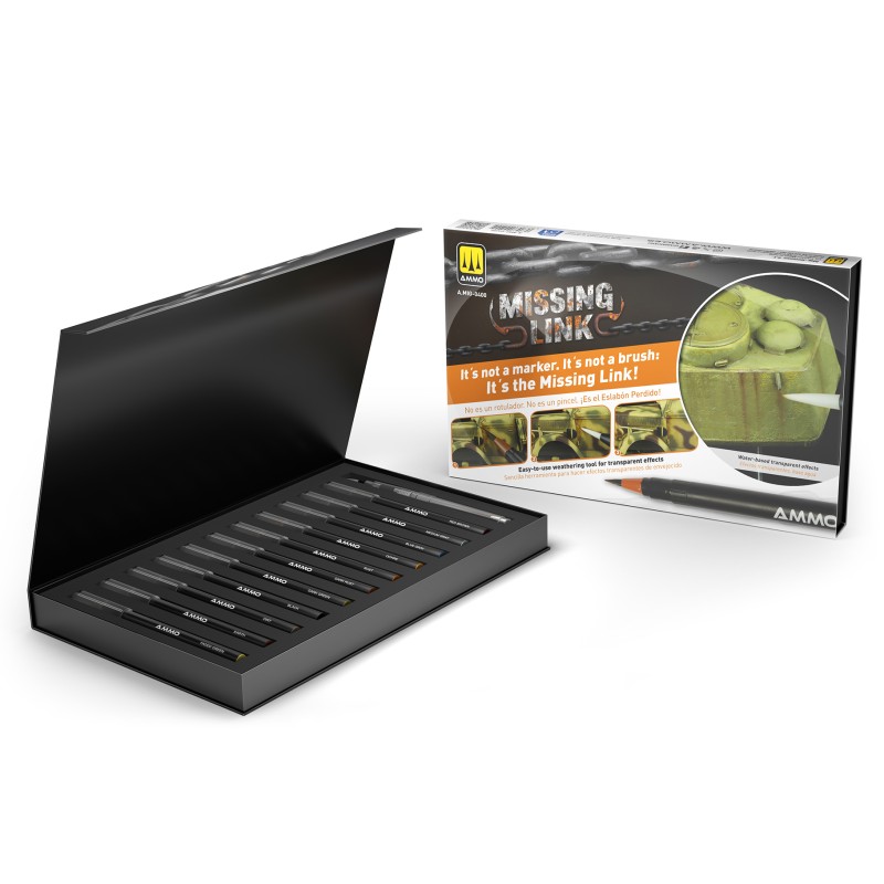 Missing Link Brush Tip markers är utvecklade för modellbyggare som vill uppnå realistiska väderingseffekter på militära fordon. Transparenta pigment och flexibla borstar gör det möjligt att skapa damm, smuts, rost och andra naturliga effekter som smälter in i underliggande färger. Markerarna kan blandas eller tas bort med vatten och blending marker, vilket ger full kontroll över slutresultatet.