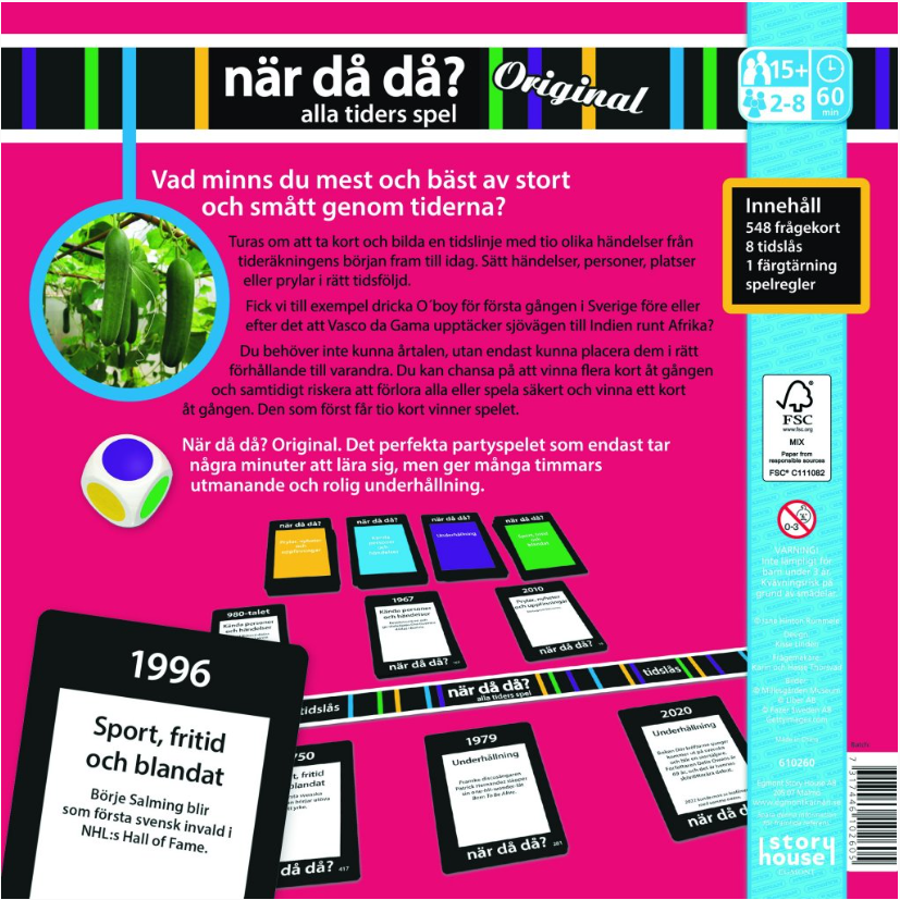 Ett av Sveriges mest populära spel kommer här med en ny version och nya frågor. Turas om att ta kort och bilda en tidslinje med händelser. Passar att spela både enskilt och i lag.