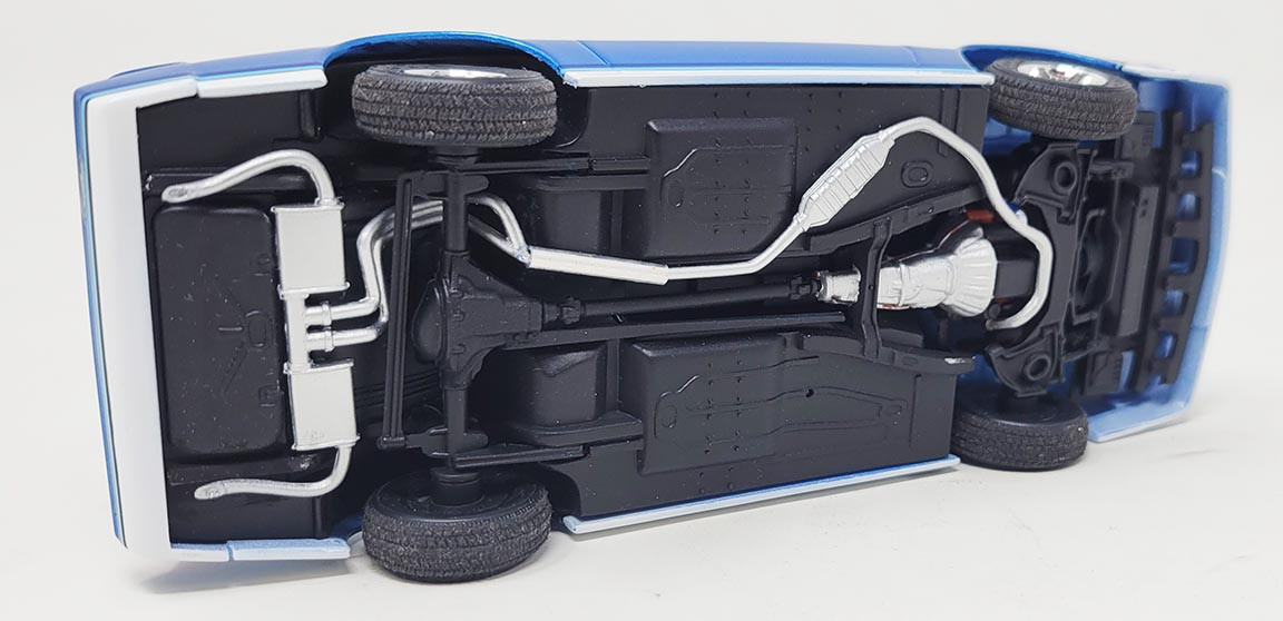 Modellen är gjuten i metallisk blå plast med kromade och klara delar för fönster, strålkastare och bakljus. Den har öppningsbar motorhuv som visar en detaljerad V8-motor, samt ett detaljerat chassi och interiör. Äkta gummidäck ingår, och de nyuppdaterade dekalerna med racing-stripes ger bilen ett autentiskt och livfullt utseende.
