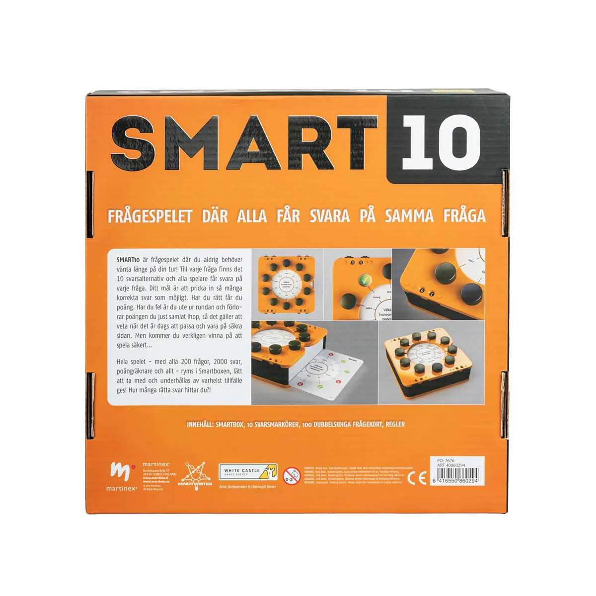 SMART10 är ett frågespel där alla får en chans och deltar aktivt: det finns 10 svarsalternativ till en fråga och alla spelare eller lag svarar i turordning på varje fråga. Du behöver alltså inte vänta länge på din tur! Men lönar det sig att svara eller att passa? Om svaret är rätt får du en svarsmarkör. Men om du svarar fel, förlorar du markörerna som du samlat för frågan och blir utan poäng. Hur många rätta svar vågar du chansa på?