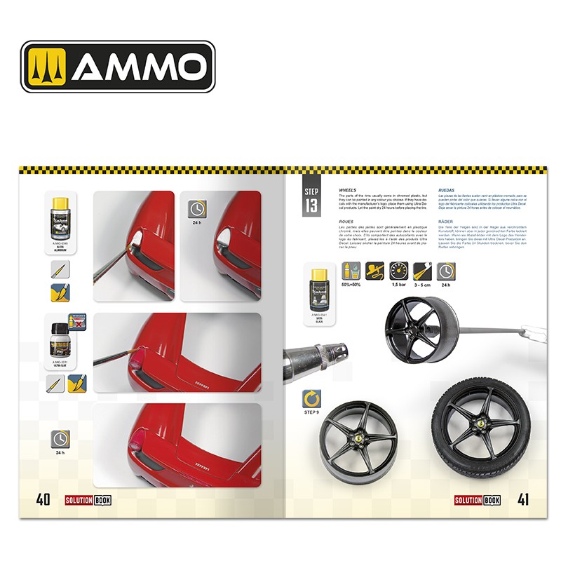 SOLUTION BOOK – How to Paint and Lacquer Scale Cars är en komplett 46-sidig guide med steg-för-steg-instruktioner på fyra språk (engelska, spanska, franska och tyska). Här får du lära dig hur du målar och klarlackerar modeller av civila fordon – både väg- och tävlingsbilar, motorcyklar, lastbilar eller andra typer av fordon.