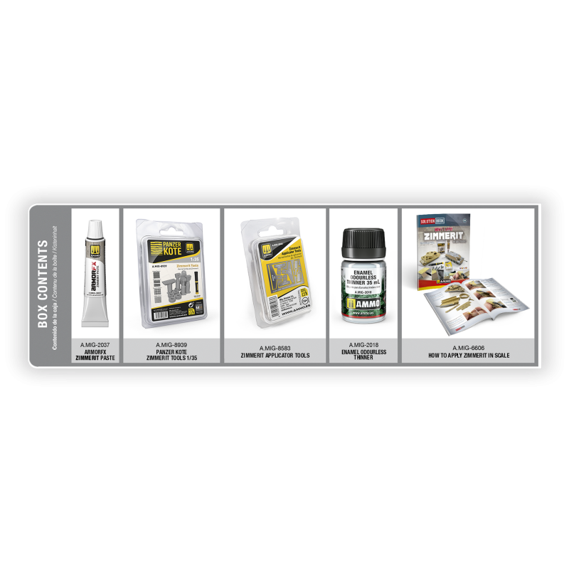 SOLUTION BOX MINI 31 – Hur man applicerar ZIMMERIT i skala erbjuder allt du behöver för att återskapa Zimmerit på tyska stridsvagnar från andra världskriget. Här är en närmare titt på vad detta kit innehåller: