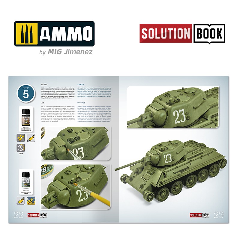 Solution Box Mini 4BO Russian Green Vehicles offers you everything you need to paint and weather your models of WWII Soviet Army vehicles. You will not only find the accurate colour paints, weathering products, and brushes, we have also included the valuable resource Solution Book - How to Paint 4BO Russian Vehicles as well. This complete 52-page guide with step-by-step tutorials in four languages (English, Spanish, French, and German) explains how to apply the different colours and effects common to Red Army vehicles painted in a monotone scheme of 4BO. SOLUTION BOOK is a simple and basic guide intended to help any modeller easily achieve similar results to those shown in each example. It doesn´t matter if the reader is a novice or a more seasoned and experienced modeller, by following the steps in this guide you will be able to obtain amazing results with the efficient and effective methods shown.