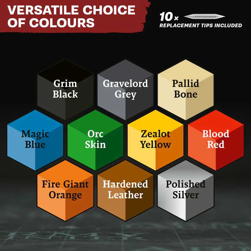 Innehåll: 10 Speedpaint Markers i färgerna Magic Blue, Fire Giant Orange, Hardened Leather, Grim Black, Pallid Bone, Orc Skin, Zealot Yellow, Gravelord Grey, Blood Red och Polished Silver (metallic).
