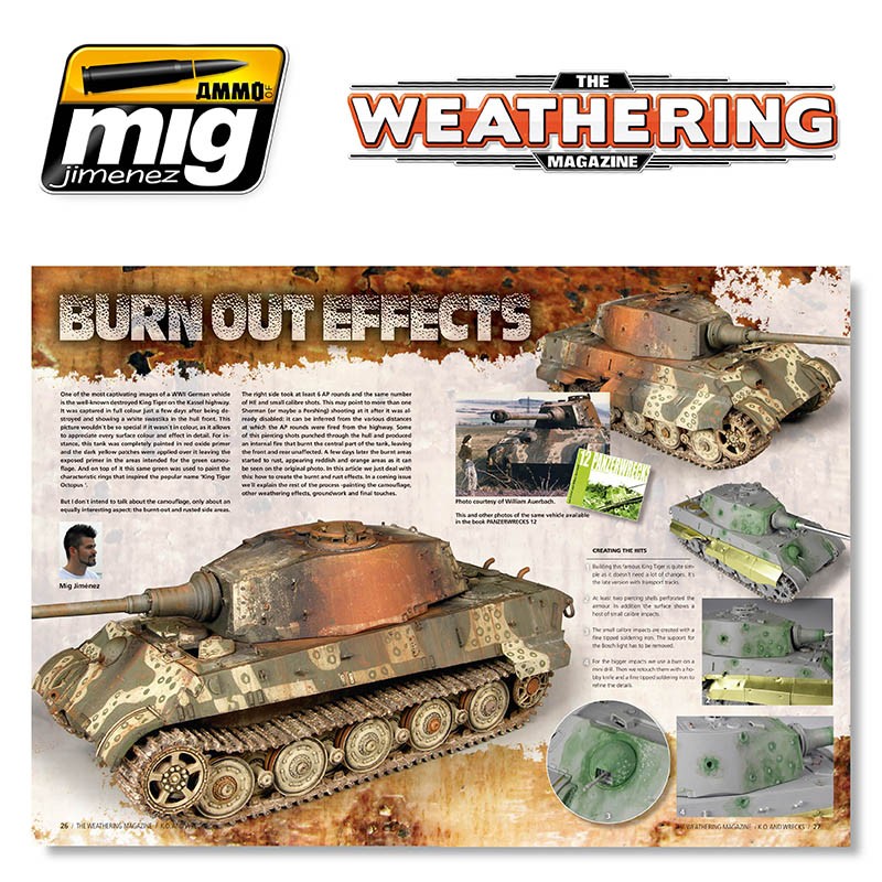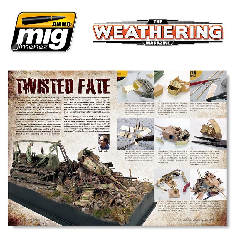 The only magazine in the world devoted exclusively to the weathering effects and paint in general for all kinds of modeling. This issue is dedicated to destroyed, abandoned, and sunken vehicles.The best modellers in the world will offer a repertoire of exceptional examples and they explain with detailed step by step process, all the newest tricks and techniques to get your models represent similar conditions. From a totally abandoned "Walker" futuristic robot, a wooden sunk boat, a Tiran 5 absolutely burned or a jet fighter abandoned in the open. But you can also discover how to burn impacts and effects on a King Tiger or a weather a train wagon full of graffiti. TWM is a collectible magazine, 64 pages, printed on high quality glossy paper and full of useful items for any field of model. Available in 7 different languages, this is the most international magazine in the world.