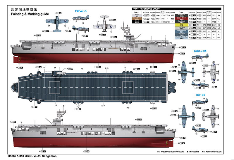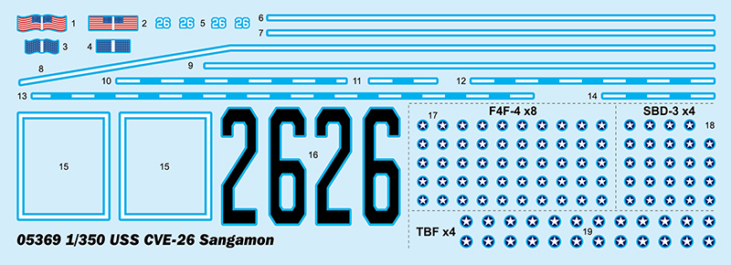 Artikelnummer: 05369 Artikelnamn: USS CVE-26 Sangamon Streckkod: 9580208053691 Skala: 1:350 Typ av produkt: Plastmodellbyggsats för krigsfartyg Modellens längd: 478,3 mm, Bredd: 95,8 mm Antal delar: Över 390 Metalliska delar: Ingen Fotoetsade delar: 1 stycke Filmade delar: Ingen Resin-delar: Ingen Antal ramar: 25 ramar och däck Släppdatum: 2021-10 Övriga funktioner: - kittet innehåller över 390 delar - skrovet delat i två delar - däck med trästruktur fint återgivet - Innehåller displayställ - fotoetsade delar ingår.