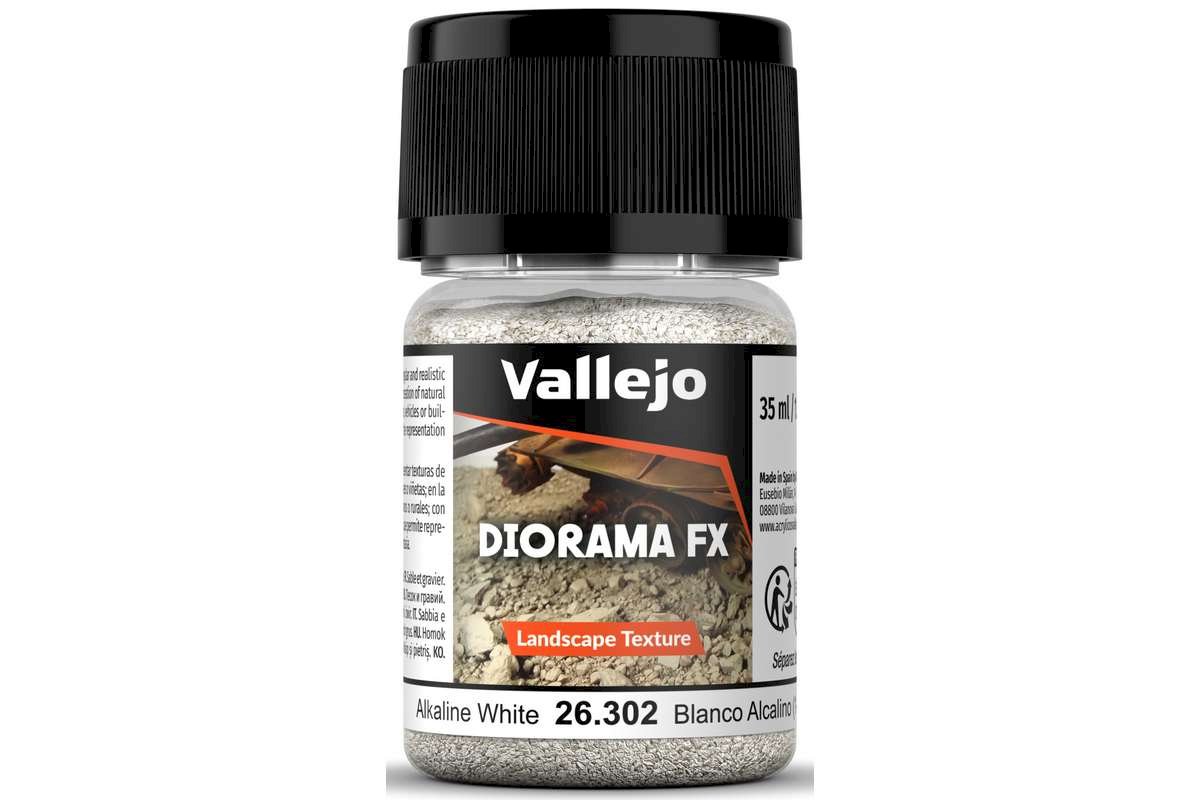 Vallejo Diorama FX Alkaline White 1–2 mm, 35 ml är ett kalkstenspulver som efterliknar torra, kritrika jordar och kalkstensmarker. Perfekt för dioramor, terrängscener och vignetter med hög realism.