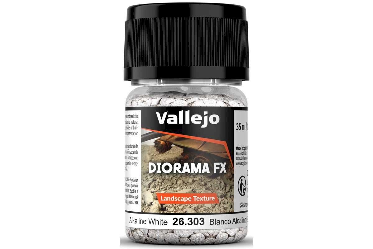Vallejo Diorama FX Alkaline White 2–5 mm, 35 ml är ett kalkstenspulver som efterliknar torra, kritrika jordar och kalkstensmarker med större kornstorlek. Perfekt för dioramor, terrängscener och realistiska vignetter.