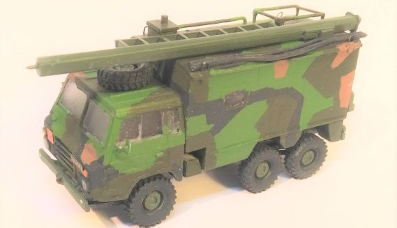 - Inkluderar detaljerade tillbehör som antennmast, kabelrullar, sirener, spotlight, bränsledunkar och reservhjul.